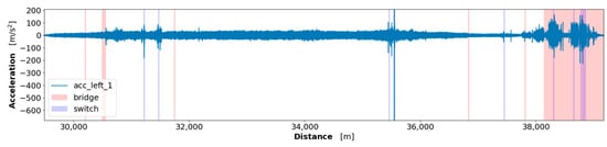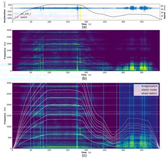 - The bridges and switches shown in Figure 5 appear as impulsive vibrations that excite all frequencies in a very short time. Therefore, they can be seen as vertical lines in the spectrogram in Figure 9b and as highlighted vertical sky-blue lines in Figure 9c. Again, there is a good agreement between the construction positions and the resulting effects on the axle box accelerations. However, not all of them have a significant effect on the accelerations, especially where the vehicle is running at lower speed.