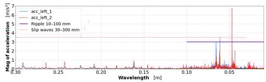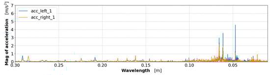 To verify that the axle box accelerations are consistent with the microphone measurements, the FFT analysis is performed on the left side as shown in Figure 6. The acceleration measurements clearly show peaks within the wavelength range of the rail corrugation. These peaks can be observed on the left side on both the first and second wheelset of the front bogie (main acceleration peaks at wavelengths: 65, 60, 47 mm).