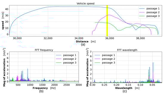 (a) Vehicle speed of three vehicles passing over the same track section. The section under investigation identified by the microphone measurements analysis is highlighted in yellow. Magnitude of the axle box acceleration in frequency domain (b) and in wavelength domain (c) of the three vehicle passages.