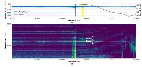 (a) Axle box acceleration in distance domain. The section under investigation identified by the microphone measurements analysis is highlighted in yellow; (b) Spectrogram in wavelength domain. The lines labelled with A, B and C correspond to the three peaks found in the FFT at 65, 60, and 47 mm, respectively.