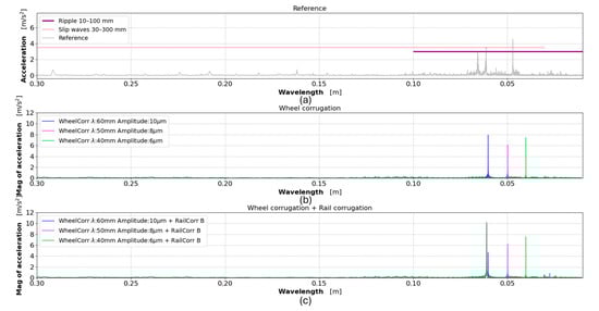 Figure 11a shows the reference FFT of the axle box acceleration (Figure 6) with the ripple and slip waves wavelength range. Figure 11b shows the FFT of the axle box accelerations from three simulations. These three simulations are performed considering only wheel corrugation as in scenarios 1, 2 and 3. Figure 11c shows the results of wheel and rail corrugation for scenarios 4, 5 and 6.
