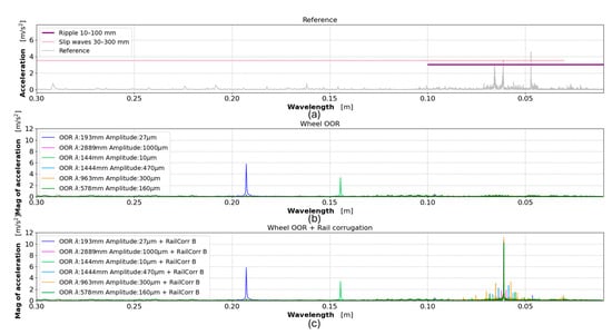 As mentioned above, the wavelength range of the OOR is typically between 140 mm and the wheel circumference, which is greater than the peaks observed in the axle box acceleration measurements. The scenarios presented in Figure 12b prove that only the unusual very high order of the OOR (15th–20th) can be observed in the wavelength range of the rail corrugation. However, when rail corrugation with a wavelength of 61 mm is added (c), some OOR effects can be observed around the corrugation peak.