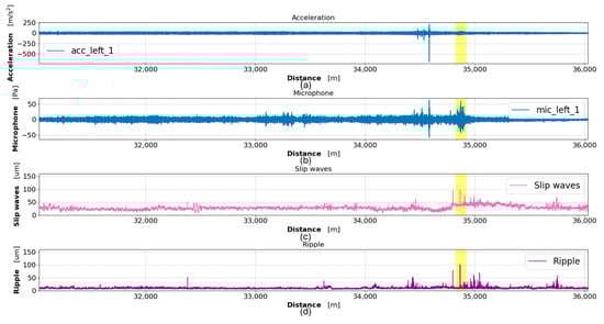 (a) Axle box acceleration; (b) microphone measurement; (c) slip waves indicator; (d) ripple indicator. The section where the corrugation has been found is highlighted in yellow.