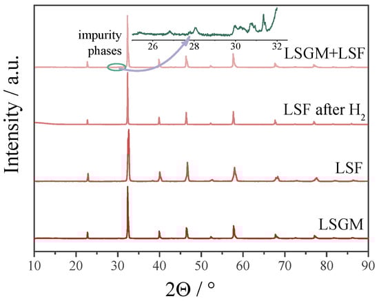 X-ray diffractograms of the investigated LSGM and LSF powders are shown in Figure 1. The powders were found to be single phase. The stability of LSF in pure hydrogen atmosphere was also verified. The chemical and structural stability of LSF in a hydrogen atmosphere is an important property for studying the electrochemical activity of LSF electrodes (these data are shown below). The results showed that no impurity phases are formed in LSF after 24 h of exposure at 800 °C in a hydrogen atmosphere (purity of at least 99.99 vol.%). The compatibility of LSF + LSGM (mass ratio 1/1) was also tested at 1150 °C for 2 h, which corresponds to the sintering conditions of LSF electrodes. The XRD study of the LSGM + LSF powder showed some minor peaks in 30° regions (Figure 1), which can be attributed to SrLaGa3O7 and/or SrLaGaO4 phases [26,61]. The formation of magnesium-free phases has been observed in many studies [62,63,64]. Taking into account the minor concentration of these phases (not exceeding 1 wt.%), it can be reasonably assumed that its presence will not affect the primary properties of the LSF electrodes. It is also important to note that the sintering additives (copper and iron oxides) examined in this study are reduced to metal in a reducing atmosphere. These results will not be presented here, as they represent basic data. However, a discussion of this topic will be provided later in the paper.