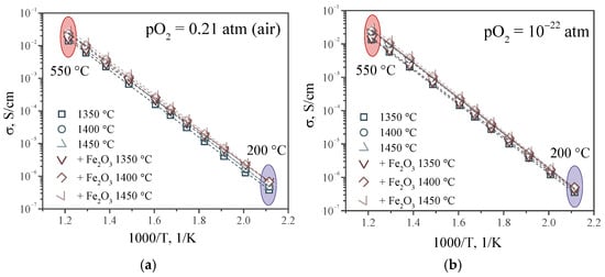 Temperature dependences of the electrical conductivity for the investigated LSGM samples under atmospheres with various oxygen partial pressures: 0.21 atm (a); 10−22 atm (b).
