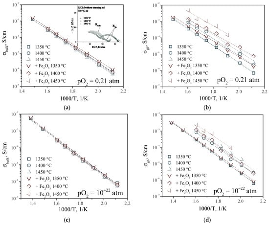 To obtain a better understanding of the influence of sintering temperature and introduction of the sintering aid on electrical conductivity of the electrolyte, the contributions of grain bulk and grain boundaries to the electrolyte’s conductivity were determined. At temperatures below 400 °C, two semicircles, corresponding to the bulk and grain boundary resistances, can be clearly observed on the impedance spectra (insert in Figure 3a). Thus, impedance data were analyzed according to the equivalent circuit (RQ)bulk(RQ)gb. Using the obtained values of the resistances, conductivities of the grain bulk and the grain boundaries were calculated (Figure 3a–d). One can see that in both atmospheres, the bulk conductivity remains almost the same, while grain boundary conductivity strongly depends on sintering temperature and Fe2O3 addition. Both the increase in sintering temperature and introduction of the sintering aid led to an increase in the grain boundary conductivity. Activation energy values of bulk and grain boundary conductivity are close for all the samples and conditions, and remain almost the same for all the cases (Table 1). Figure 3e,f also summarize the total, bulk and grain boundary conductivity for all the samples and conditions at a constant temperature. The addition of Fe2O3 along with sintering at 1400 °C results in a conductivity even higher than that after sintering at 1450 °C without the sintering aid. Further improvement can be achieved with sintering at 1450 °C. Sintering at 1350 °C is not enough even with the Fe2O3 addition.