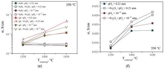 Temperature dependences of bulk (a,c) and grain boundary (b,d) conductivity for the investigated samples under pO2 = 0.21 atm (air) (a,b) and pO2 = 10−22 atm (c,d). Electrical conductivity of the investigated samples as a function of sintering temperature: bulk and grain boundary conductivity at 350 °C (e); total electrical conductivity at 550 °C (f).
