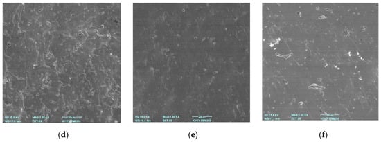 SEM images of chipped electrolyte samples. (a–c) LSGM; (d–f) LSGM + Fe2O3. Sintering temperature 1350 °C (a,d); 1400 °C (b,e); 1450 °C (c,f).