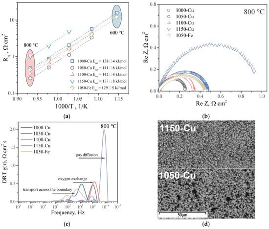 In the studies of LSF electrodes with the sintering aids, it was demonstrated that the polarization resistance in air is significantly dependent on the sintering temperature (Figure 5a). Therefore, at a study temperature of 800 °C, the polarization resistance exhibited a four-fold variation as a function of the sintering temperature. The 1050-Cu sample exhibited the most favorable outcomes, with a value of approximately 0.25 Ω cm2, while the 1150-Cu sample demonstrated the least favorable outcomes, with a value of approximately 1 Ω cm2. The 1050-Fe electrode demonstrated intermediate-quality results, exhibiting a polarization resistance of approximately 0.45 Ω cm2 at 800 °C. It is noteworthy that the slope of the temperature dependence (activation energy) of the polarization resistance of electrodes with copper oxide and iron oxide addition was found to be relatively high, approximately 140 kJ/mol, and exhibited minimal dependence on the sintering temperature, suggesting the potential for these electrode materials in the high-temperature region. For a more detailed understanding of how the sintering temperature affects the electrode reaction mechanism, impedance spectra and DRT functions calculated from them were considered (Figure 5b and Figure 5c, respectively). For all investigated electrodes, the spectra are a single half-circle with no visual separation into semicircles. However, despite the visual similarity of the spectra, the obtained DRT functions differ significantly. Thus, the 1000-Cu sample is characterized by the presence of a split peak in the frequency range of 2–100 Hz. For electrodes 1050-Cu and 1100-Cu, the DRT functions register only one main peak with a frequency at the maximum of about 1 Hz. For these samples, minor peaks of very low intensity are also present; we do not consider them since the contribution of these stages to the polarization resistance is not significant. For 1150-Cu, two peaks are found, one of low intensity at 1 Hz and one with high intensity at 0.1 Hz. A distinct trend can be observed in the case of utilizing copper oxide as a sintering aid. The nature of the rate-determining steps of the oxygen reduction reaction changes with increasing sintering temperature, and their specific frequencies are shifted to the low-frequency region. In the case of the 1050-Fe sample, the DRT function is comparable to that of the 1000-Cu, albeit exhibiting a slight shift towards the high-frequency region (Figure 5c). This behavior can be attributed to the higher melting temperature of iron oxide in comparison to copper oxide. The number of peaks and their relaxation frequencies, as derived from the DRT functions, allow us to hypothesize about the nature of the stages that limit the rate of the oxygen reduction reaction. In the case of the 1000-Cu sample, these processes are observed at the electrode/electrolyte boundaries and between the electrode particles. They appear to be related to the slow transport of electrons and/or oxygen ions across the boundaries, which can be attributed to the low sintering temperature of the electrode and the poor quality of the interfacial boundaries. As the sintering temperature increases, the electrode adhesion increases and the rate of electron and ion transport across the boundaries increases. For electrodes sintered at higher temperatures of 1050-Cu and 1100-Cu, the rate-determining stage of oxygen reduction is the interfacial exchange of electrode oxygen with the gas phase [39]. The DRT function for the 1150-Cu sample exhibits a low-frequency peak, which is characteristic of gas diffusion processes [65]. This peak is a consequence of a notable reduction in electrode porosity at the sintering temperature of 1150 °C. Consequently, the porosity estimation derived from micrographs using the ImageJ software (version 1.51j8) package indicated a value of approximately 62% for the 1050-Cu sample and approximately 35% for the 1150-Cu sample (Figure 5d).