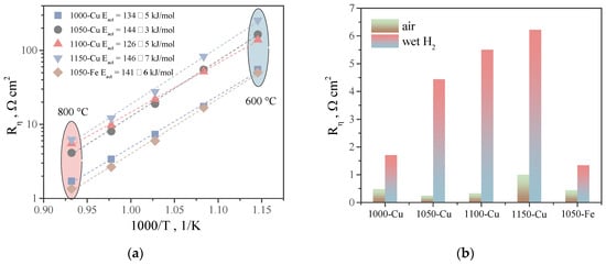 As previously stated in the Introduction, symmetrical electrochemical cell electrodes must operate efficiently in both oxidizing and reducing atmospheres. Accordingly, we proceeded to examine the electrochemical behavior of LSF electrodes in a wet hydrogen atmosphere. Figure 6a illustrates the temperature dependence of the polarization resistance of LSF electrodes in a wet hydrogen atmosphere. A comparison of these data with the results presented in Figure 5a reveals that the sintering temperature and the type of sintering aid exert disparate effects on electrode performance in different atmospheres. In particular, the polarization resistance of the samples with copper oxide was observed to increase with an elevated sintering temperature. The lowest polarization resistance was observed for the 1000-Cu sample, reaching approximately 1.7 Ω cm2 at 800 °C. Conversely, the highest polarization resistance was recorded for the 1150-Cu sample, approximately 6.5 Ω cm2 at the same temperature. It is noteworthy that the polarization resistance of the 1050-Fe electrode exhibited the highest performance among all studied samples, reaching approximately 1.3 Ω cm2 at 800 °C. The results demonstrated that the activation energy of the polarization resistance in a wet hydrogen atmosphere is nearly identical to that observed in air (Figure 5a and Figure 6a). This finding suggests that the rate of the hydrogen oxidation reaction may be constrained by the same processes that regulate the oxygen reduction reaction. Figure 6b presents a comparison of the polarization resistance for all investigated electrodes in various atmospheres at 800 °C. From the perspective of utilizing the electrodes in symmetrical cells, electrode 1050-Fe demonstrates the most effective performance. It exhibits the most optimal values of polarization resistance in both oxidizing and reducing atmospheres. A comparison of the obtained values of polarization resistance for 1050-Fe with the literature data for electrodes of symmetrical electrochemical devices reveals that it is on a par with the majority of the studied ferrites, with the exception of the most promising materials for symmetrical electrodes based on strontium ferrite-molybdate (Table 3).