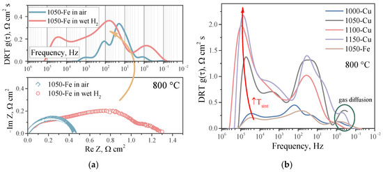 A comparison of the electrochemical impedance spectra of 1050-Fe in oxidizing and reducing atmospheres reveals significant differences (Figure 7a). The DRT functions calculated from these spectra revealed that the primary discrepancies in the mechanisms of hydrogen oxidation and oxygen reduction reactions are associated with the emergence of a high-frequency process of considerable intensity in the reducing atmosphere. In contrast, the remaining peaks were previously observed on the DRT function for the oxidizing atmosphere and exhibited only minor alterations following the transition to the reducing atmosphere. A consideration of the DRT functions for all the studied samples in the atmosphere of wet hydrogen reveals that, according to a rough approximation, the mechanism of hydrogen reduction at all the studied electrodes is essentially the same. This is in contrast to the air atmosphere, where shifts of peaks or the appearance of new ones are observed. Instead, in the wet hydrogen atmosphere, only changes in peak intensity are evident (Figure 7b). The high-frequency peak is characterized by the greatest intensity changes. Given the relaxation frequency of this peak, it can be posited that this process represents a stage of charge transfer at the triple-phase boundary. This assertion is indirectly corroborated by the capacitance value calculated from the impedance spectrum, which is approximately 5 × 10−6 F/cm2. This stage is localized at the three-phase electrolyte/electrode/gas boundary. It can therefore be reasonably assumed that with the increase in the sintering temperature, there is an increase in the area of contact between the electrolyte and the electrode, and the extent of the triple-phase boundary decreases. This leads to an increase in the resistance of this stage. As illustrated in Figure 5c in an oxidizing atmosphere, this step in the DRT function is absent. This is due to the fact that LSF exhibits markedly enhanced oxygen and electronic conductivities in an oxidizing atmosphere, allowing this stage to be localized at the electrode/gas dual-phase boundary. The remaining stages of the electrode reaction for hydrogen oxidation are analogous to those observed previously for the oxygen reaction and include the particles’ adsorption, interfacial exchange with the gas phase, and the gas diffusion stage. It is noteworthy that in the case of a wet hydrogen atmosphere, the response from the gas diffusion stage is registered for all electrodes, which is a distinctive feature of the hydrogen atmosphere due to the high coefficient of interdiffusion of the gas mixture in comparison to the air [78]. The reasons why the DRT functions for 1000-Cu and 1050-Fe were similar have been previously stated and appear to be related to the higher melting point of iron oxide compared to copper oxide, which affects the microstructure of the electrode and its adhesion to the electrolyte. It is also noteworthy that in a wet hydrogen atmosphere, both sintering aids are reduced to metal. As evidenced by [79], iron exhibits slightly greater activity in the dissociative adsorption reaction of hydrogen compared to copper. This results in a slightly higher activity of the 1050-Fe electrode compared to that of the 1000-Cu electrode in a wet hydrogen atmosphere.