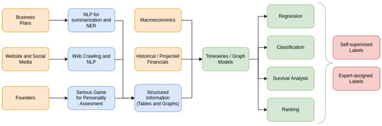 Typically, Cox proportional hazard functions are used to measure new-venture survival [7,8,9] as well as survival-time regressions [10]. In recent years, the rapid development of AI has offered many tools for startup success prediction. Żbikowski and Antosiuk [11] created a predictive model based on supervised learning to identify business success at an early stage. Sadatrasoul et al. [12] evaluate accelerated startups by applying six well-known classification algorithms. Dellermann et al. [13] utilize information regarding team size and entrepreneurial experience to assess startups’ survival through a hybrid intelligence model. Prediction of the success probability for new companies in the US and China is conducted by Pan et al. [14] in order to classify the sample into successful and not-successful entities. Ünal and Ceasu [15] employ a set of different models, such as Random Forest, conditional reference tree, and recursive partitioning trees, with aim of predicting the success rates for future new ventures. It should be noted that the great majority of previous works focus on financial information in order to evaluate startup sustainability, omitting important factors such as founder personality, team dynamics, and information that is available in natural language, such as business plans.