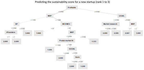 To provide further insight regarding the workings of the model, a visualization of a good-performing decision tree is shown in Figure 3. By observing the rules, we infer that the tree first considers whether the startup is already profitable. The highest score is achieved for companies that are profitable, have presented a high-quality MVP, and have an annual income that exceeds EUR 57,000. Different branches of the tree also consider whether the company has a legal form, the product–market fit, the number of founders, and the quality of market research, social network activity, and the pitch deck. The lowest score is given to startups that do not have a legal form and have not presented an MVP.