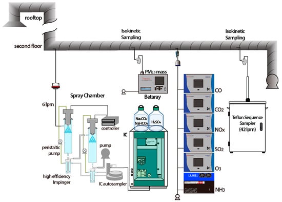 The mass concentration of PM2.5 was determined using Teflon filter sampling and the beta-ray absorption method (5014i Beta Continuous Ambient Particulate Monitor, Thermo, Fisher Inc., Waltham, MA, USA). We conducted three-hour integrated sampling, employing Teflon filters with a Mid-Volume Air Sampler (MAS-16, APM Engineering Co, Gyeonggi-do, Republic of Korea) coupled with a cyclone (URG-2000-30EC, URG Corp., Chapel Hill, NC, USA), which operated at a flow rate of 42 L/min. The beta-ray absorption method measured hourly mass concentrations at a flow rate of 16.7 L/min and was corrected using the difference in the weight of the Teflon filter before and after sampling. To collect PM2.5 from the main duct on the roof, we adjusted the cross-sectional area of the inlet to achieve isokinetic sampling conditions. The Teflon filter was subsequently processed for extraction and analysis for anions and cations. Each Teflon filter was placed in a 20 mL vial, moistened with 3 mL of MeOH, followed by the addition of 16 mL of water. Following 2 h of sonication, the sample was filtered through a polyvinylidene fluoride (PVDF) syringe filter to prepare for IC analysis. Analyzed ionic components of PM2.5 included NH4+, NO3−, and SO42−. For the cation analysis, a Metrohm Metrosep C4 250/4.0 column was utilized with a 5 mM HNO3 eluent.