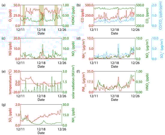 Time series variation in (a) O3 and HONO, (b) CO, CO2, and CO/CO2, (c) NO and NO2, (d) NH4+, NO3−, and SO42−, (e) temperature and solar radiation, (f) PM2.5 mass and HNO3, and (g) SO2 and NH3.