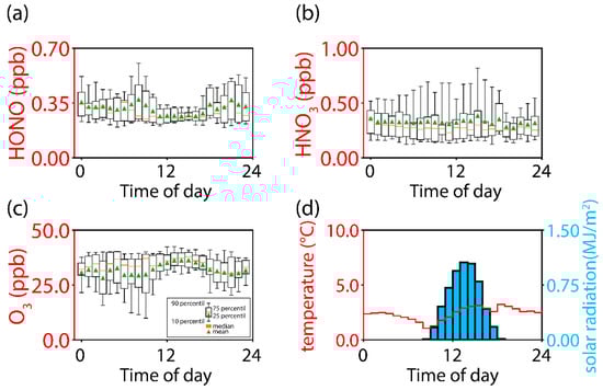 Diurnal patterns of (a) HONO, (b) HNO3, (c) O3, and (d) temperature and solar radiation.