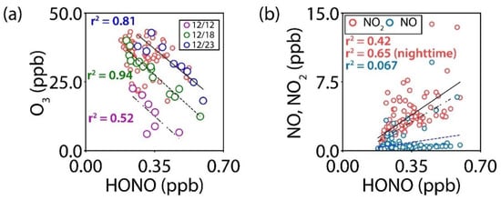 Scatter plots between (a) O3 and HONO and (b) NO, NO2, and HONO.