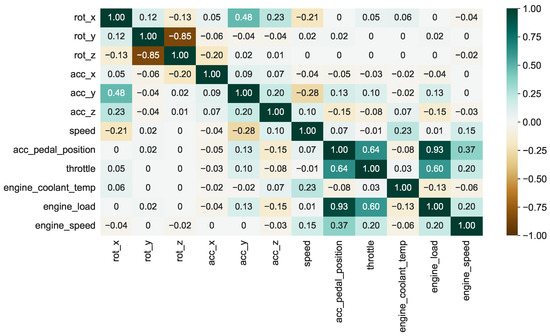 The dataset contains 251,271 samples after filtering out invalid data, where each sample consists of a camera image and a vector of numerical sensor data. The features of the data frame include IMU data (e.g., accelerations and angular velocities) and OBD2 sensor data (e.g., vehicle speed and engine parameters). The correlation analysis, visualized in Figure 1, identified a strong positive correlation coefficient (0.93) between acc_pedal_position and engine_load, leading to the exclusion of the engine_load feature from further analysis.