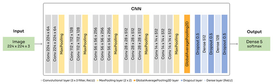 Figure 4 illustrates the CNN model’s architecture. After the convolutional layers, a GlobalAveragePooling2D layer replaces the typical flattening layer to reduce parameters and improve training efficiency [20]. The model then employs two fully connected layers with ReLU activation and dropout layers for regularization [21]. The final layer uses a softmax activation function to output probabilities for five distraction classes.