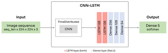 Building on the vision-based approach of the previous section, a recurrent neural network was incorporated to improve the model by considering a sequence of images instead of a single image. This section presents a CNN-LSTM model that extends the previous CNN with an LSTM network for temporal modeling.