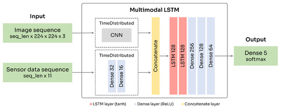 This model extends the configuration of Section 2.4.2 by adding a sensor data input, as shown in Figure 6. The input now contains both an image sequence and a sensor data sequence (seq_len × 11). The image sequences are processed by a TimeDistributed layer that applies the CNN to each image. At the same time, the sensor data are processed by another TimeDistributed layer that encapsulates a neural network with two dense layers (32 and 16 neurons). The outputs from these two TimeDistributed layers are then merged using a concatenation layer, creating a fused sequence of CNN and sensor data outputs.