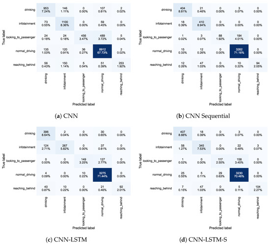 The visualization of the confusion matrices for the different models is shown in Figure 7. It is important to note that each confusion matrix represents the results of a single model, as it is difficult to capture the performance across multiple training runs. Therefore, for each model, the confusion matrix is generated using the model from the training run with the median F1 score. Additionally, it should be emphasized that the absolute numbers in the matrices are only comparable within Figure 7b–d as a different validation set was used in Figure 7a. Despite the significant differences in model behavior indicated by the metrics, similar patterns can be seen in the confusion matrices. In each matrix, the majority of samples are correctly classified, resulting in a slightly denser diagonal line from top left to the bottom right. However, due to the class imbalance, there is an outlier in the normal_driving class, which contains by far the largest number of samples. Across all models, the most frequent misclassifications occur in the looking_to_passenger class, with many samples classified as normal_driving. As mentioned before, this is due to the constant head-turning of the drivers while reading the sentences. In addition, especially in the CNN-LSTM model, there is a lot of confusion between the infotainment and drinking classes. Differentiating between samples where the driver is reaching for the infotainment system and when they are reaching for a water bottle or putting it down seems to be a challenge for the models. Both the CNN Sequential and CNN-LSTM-S models show 47 misclassifications, where reaching_behind sequences are classified as infotainment. These two classes involve manual distractions where the driver moves his right hand, which likely contributed to the difficulty in distinguishing between them for these specific models.