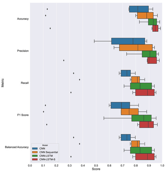 A trend is observable in the boxplots, indicating increasing performance across the models, with the CNN showing the poorest performance in each metric, followed by the CNN Sequential model, and then the CNN-LSTM model. The CNN-LSTM-S model indicates the highest 75% quantiles and maximum values for each score. This trend is also observed in the median values, except for precision, where the CNN-LSTM slightly outperforms the CNN-LSTM-S model. Nevertheless, disregarding the outliers, the boxplots suggest that the CNN-LSTM model, when considering sensor data, delivers the best performance in the leave-one-driver-out cross-validation.