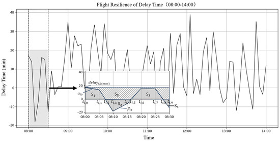 Based on the flight operations in the airport during an operational day, once a delay occurs, the airport suffers from profit losses until the delay dissipates. This duration is quantified by the resilience of flights on route over periods in one operational day. An example of the resilience of delay time is shown in Figure 1.