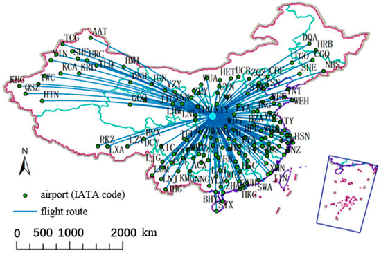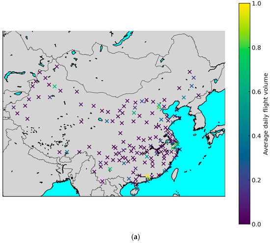 The average daily flight volume for each route is calculated based on an airport’s daily operating time of 16 h, as shown in Equation (5):
