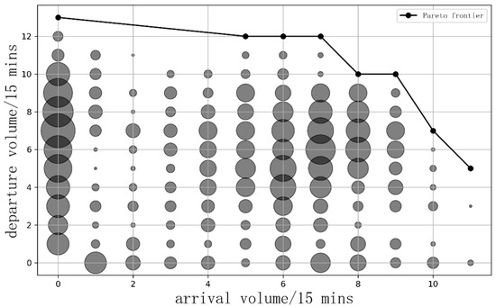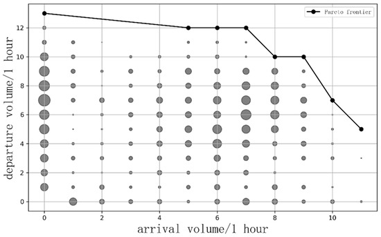The Airport Cooperative Research Program (ACRP) proposed that capacity is the maximum sustainable throughput that can be accommodated per unit of time under varying local capacity constraints [34]. According to the construction stages of airports, capacity can be categorized into pre-planning capacity, pre-operational planning capacity, and operational capacity. This study focuses on airports already in operation, thus aiming to analyze the resilience of their operational capacity. Moreover, the bottleneck affecting flight operations under various factors is primarily the runway capacity of the airport, which can be understood as a trade-off optimization between arrival and departure capacities. For such bi-objective optimization problems, the Pareto frontier method can be applied to estimate capacity.