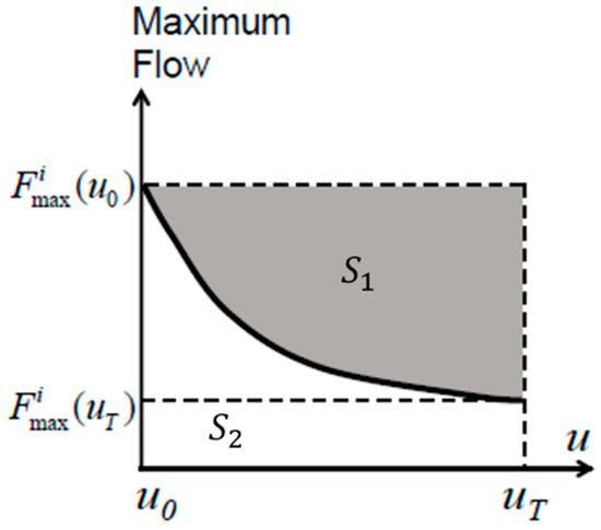 Based on the definition of robustness, RAI evaluates and quantifies the impact of localized (node-level) capacity reductions on the maximum network traffic flow [35]. In Equation (6), is the degradation parameter which represents the potential reduction in route capacity. is the maximum network traffic flow of an airport when the capacity of route reduces . Finding the maximum network traffic flow for a given degradation is equivalent to solving a linear optimization problem. Let the capacity of route be , and the objective function for the airport’s maximum traffic flow is given by the following: