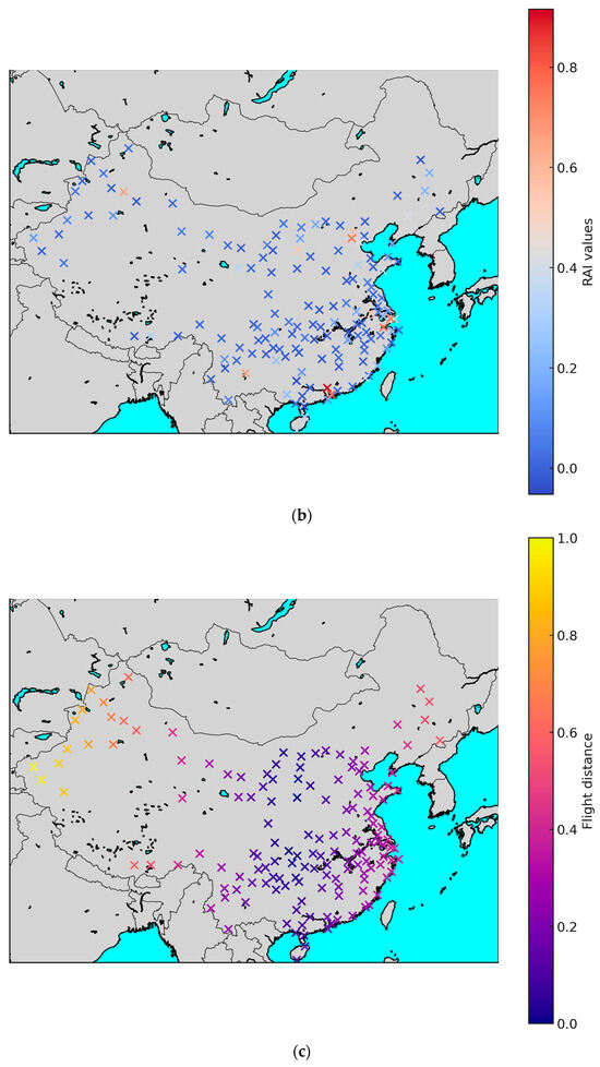 Average daily flight volume, flight distance, and RAI of each route. (a) Average daily flight volume. (b) RAI values. (c) Flight distance.