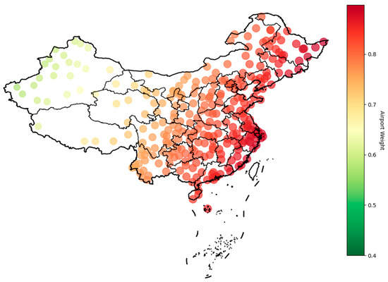 The route weights of each airport are shown in Figure 10. To analyze the regional distribution of the route weights, representative airports in different regions are listed in Table 4.