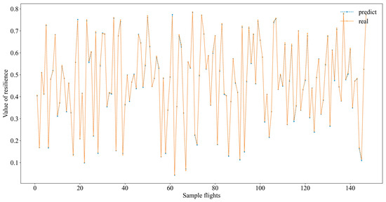 The effectiveness of the KAN prediction model was evaluated by comparing the predicted values against the actual values using multiple performance metrics. Figure 13 presents a side-by-side comparison of the actual and predicted values over the test set. In this study, we aimed to forecast changes in airport operational resilience with a lead time of 6 h. Visually, the model closely follows the trend and fluctuations in the actual data, with minor deviations in a few points. This indicates that the KAN model effectively captures upward and downward trends.