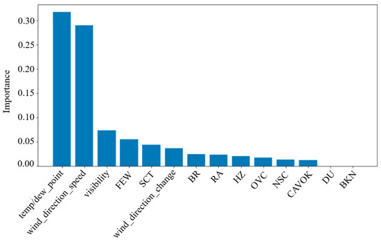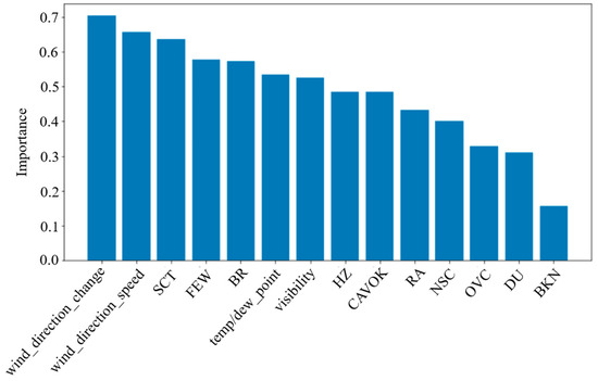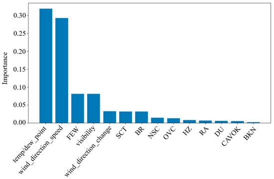 Figure 15 illustrates the importance of weather factors in economic metrics. Temperature_point and wind_direction_speed remain the most critical factors, with importance scores of 0.32 and 0.30, respectively. These results indicate that temperature and wind speed are not only essential for normal flight operations but also have a direct impact on the economic benefits of flights. In comparison, the importance of FEW, visibility, and SCT decreased, but they still warrant attention.