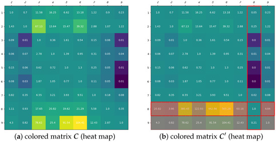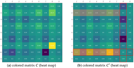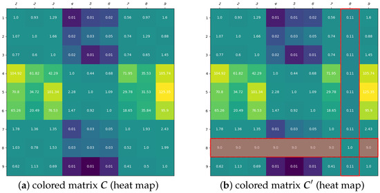 Figure 3 shows the heat maps for the advanced algorithm. Some values in the 8th row have been updated with the values from the 2nd row multiplied by the factor (and similarly all reciprocal elements), while the rest remain unchanged. The algorithm stopped after the 7th iteration of making changes to the initial matrix , promoting alternative over alternative .