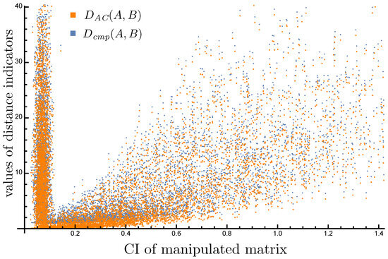 The threshold value below which the matrix is considered sufficiently consistent can be calculated empirically following the approach proposed by [19]. There are many different inconsistency indexes for PC matrices. There are at least a dozen different inconsistency indexes for pairwise comparison matrices, including Koczkodaj’s index [58], Kazibudzki’s index [59], Brunelli–Cavallo’s index [60], Kuo’s ordinal consistency indicator [61], and others [22,62]. For a matrix, monotonic increasing functional relationships exist between multiple indexes, including Saaty’s and the [63]. The properties of inconsistency indexes are the subject of numerous studies [64,65,66].