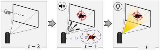 As the third approach, the signals used in existing vermin expulsion methods primarily include sound [28,29,30], flash (light), appearance that imitates fierce predators [14], such as wolves and eagles, and smell [31] stimuli. Among these signals, sound and/or flash stimuli, known as acousto-optic signals, are widely used. Examples of vermin expulsion sounds include the cry of a beast [29], gun explosions [30], and air-raid sirens. Examples of optical signals include visible light and laser beams [32,33]. This approach causes less harm to wild animals, livestock, and the natural environment than the killing approach. The installation of sound or light sources is convenient for changing the irradiation location based on the situation. However, when wild animals repeatedly experience the same acousto-optic signals, they can adapt to these signals. Accordingly, the repeated use of the same stimuli gradually reduces the effectiveness of this approach. In addition, for fixed artifact predators, vermin may learn to avoid areas facing the predators. Ultimately, these methods are ineffective in the long term; thus, vermin must be repelled by human force [34]. Unfortunately, to the best of our knowledge, no approaches have been reported as considering these limitations.
