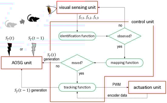 As shown in Figure 2, MiVeReR comprises four main units, and the control unit comprises three functions. Under this control architecture, the operation routine of MiVeReR begins with the input of the output data from the visual sensing unit at t. Next, from , the control unit computes the existence of an intruder and its position. To target intruders, the motor operations of the actuation unit are conducted. In addition, according to the commands of the control unit, the AOSG unit generates the desired value as output. Depending on the situation, the operation routine either returns to the visual sensing unit or forwards the commands to the AOSG unit from the control unit without involving the actuation unit.