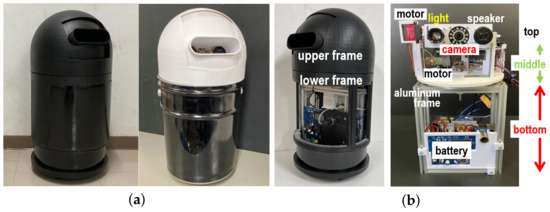 Figure 3 shows the outward frame and the internal structure of the MiVeReR prototype. An elongated robot is designed and developed to minimize the placement space on the farm. In Figure 3a, the top part is round so that rainwater or dust and tree branches do not accumulate. To expand the field of view (FoV) of MiVeReR by rotation, the upper and lower frames of the external form are separated, as shown in Figure 3b. The external form is produced using polylactic acid materials. The lower frame of the robot is made of aluminum alloy to allow its use in wet environments. The colors of the outward frame are changed according to displacement locations so that farmers are not surprised by the robot’s appearance.