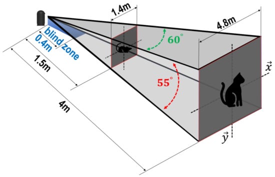 In Figure 5, the valid FoV ranges of MiVeReR based on the visual sensing unit are defined according to the horizontal and vertical planes. As explained in Section 2.1, MiVeReR targets at mice and wild cats. Depending on their average sizes in Japan, individual ranges of measurements are set to 1.5 m and 4 m, respectively. Due to the height of the camera, a blind zone of 40 cm exists. The use of the DC and servo motors enables two types of rotational directions. The DC motor makes the upper frame rotate along around . This rotational direction is called the yaw rotation (see the left side in Figure 4a). The top part rotates along around , which is called the roll rotation.