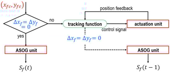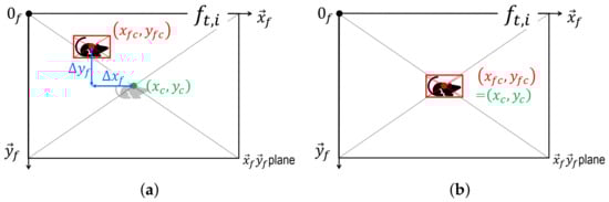 On the one hand, if the intruder moves, i.e., and/or , the tracking function in the control unit calculates and . The basic concept underlying this function is that the two points must remain coincident, as shown in Figure 8b. To achieve , a proportional and derivative (PD) controller is integrated. Next, the actuation unit, which receives input from the tracking function, drives the motors using a PD controller. According to the feedback outputs of the actuation unit, the tracking function examines whether and coincide with each other. Then, the state of their coincidence is sent to the AOSG unit (see Figure 7). On the other hand, if the intruder does not move between and t, the control unit transmits the state to the AOSG unit.