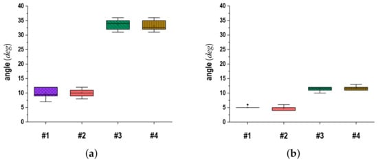 Second, to examine the tracking accuracy of the control and actuation units, experiments were conducted based on the settings shown in Figure 10a. When the object used in the previous experiments was repeatedly moved from an assigned location to individual positions (, , , and ), we examined how accurately MiVeReR followed the target locations. Figure 12 shows the results where the actuation unit generated the movements of MiVeReR according to and calculated by the tracking function. The left and right graphs show the movement results in the and directions, respectively. The results for exhibited wider variations than those for . As explained in Section 2.3, the overall upper frame rotates along , whereas the AOSG unit rotates along . Therefore, it was thought that the two directions varied. Thus, we verified that the control flow from the tracking function to the actuation unit allowed MiVeReR to generate movements that corresponded more closely to the assigned locations.
