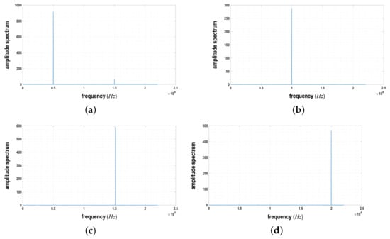 Experimental results for generation in the ASOG unit according to four different frequencies (blue lines); (a) 5000 Hz; (b) 10,000 Hz; (c) 15,000 Hz; (d) 20,000 Hz.