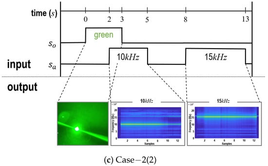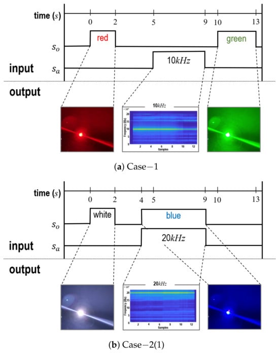 Fourth, to verify the feasibility and computation process of generation under the control flow of MiVeReR, experiments were conducted. Figure 15a shows the results for generation after object detection. Here, this experimental setting is referred to as Case−1. The ASOG unit hit a red flash for 2 s, which is denoted as . At 5 s, a 10,000 Hz sound was generated for 4 s, which is denoted as . From 10 to 13 s, with a green flash was lit. From the results, the generations could be accurately conducted according to the control commands. Next, Figure 15b,c show the consecutive experimental results for Case−2. After object detection, the ASOG unit generated at . However, the object remained stationary. Then, the ASOG unit based on the control unit generated another at t. In the first stage (Case−2(1) in Figure 15b), the ASOG unit generated a white flash for 2 s. Then, from 4 to 9 s, the ASOG unit simultaneously generated the blue flash as and a 20,000 Hz sound as . However, the object did not move. In the second stage (Case−2(2), see Figure 15c), the ASOG unit generated a green flash for 3 s. While lighting the green flash, specifically at 2 s, the ASOG unit generated both a green flash and a 10,000 Hz sound. At 8 s, only the sound frequency was changed to 15,000 Hz. The results show that the combination of acousto-optic signals could be verified according to the situation based on the control unit.