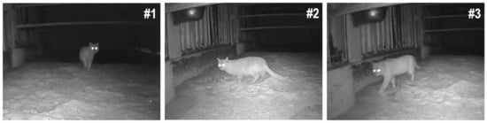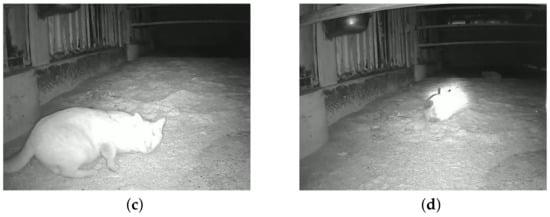 We also conducted experiments to evaluate the operation of MiVeReR in a cattle kraal. Practically, this kraal was an empty space where cattle were not raised. MiVeReR was evaluated at this location since we heard from workers that wild cats frequently appeared. As shown in Figure 19, the snapshots demonstrate that MiVeReR successfully detected a cat within the target area and outputted . In addition, the combined of a white flash and 5000 Hz sound showed that the cat reacted to the signal from MiVeReR. To analyze the cat’s reactions to , a video clip was recorded and used. Through the video data, we observed that the invasion of wild cats caused MiVeReR to track the cats and hit successfully. In addition, the different reactions of the cat according to (Figure 19b,c) confirmed that MiVeReR generated depending on the cat’s responses. Finally, Figure 20, taken from a different day, shows the snapshots of the MiVeReR’s tracking depending on the movements of the wild cat. After the detection of an intruder, MiVeReR hit (). When MiVeReR generated by focusing on the intruder, the intruder appeared wary of its surroundings (). The intruder was pictured running away to a place where there was no (). Consequently, the experimental results could confirm the validity of the generation of and the intruder’s location tracking by MiVeReR despite the intruder’s movements.
