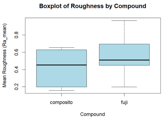 Roughness values (Ra) obtained for the two materials under study, following the various treatments, are presented in Table 3. The comparison of the mean roughness (Ra_mean) between the composite resin and the Fuji™ IX glass ionomer cement is illustrated in Figure 1. The figure demonstrates that the composite resin exhibits a lower mean roughness and less variability (as indicated by a narrower interquartile range) compared with Fuji™ IX. On the other hand, Fuji™ IX shows greater variability in roughness, suggesting that this material is more susceptible to variations in testing conditions. These results imply that the composite resin tends to produce more uniform and predictable surfaces, while Fuji™ IX may generate rougher and less consistent surfaces.