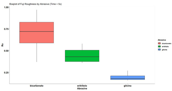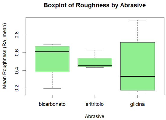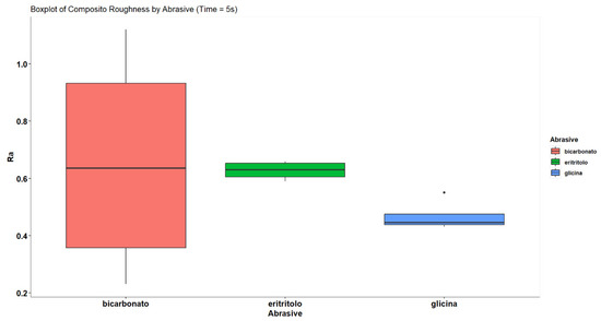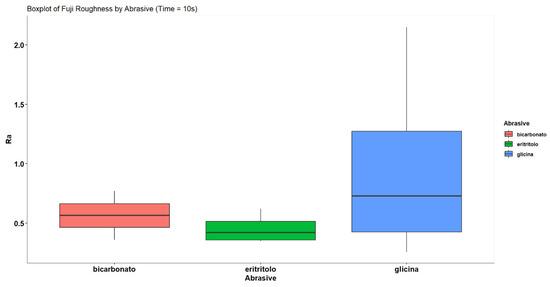 A closer examination of the roughness values for the composite resin after 10 s of application with the three abrasives is shown in Figure 4. The boxplot reveals significant variations in measured roughness (Ra). Erythritol has a range of Ra values varying from 0.26 to 0.54, with a mean around 0.44. The distribution is broad, with most data concentrated in the upper part of the range, suggesting moderate variation in roughness when using erythritol. Sodium bicarbonate, in contrast, presents Ra values between 0.11 and 0.41, with a significantly lower median than erythritol, reflecting overall lower roughness. The interquartile range (IQR) is narrower, and there is a greater concentration of data in the lower part of the range, indicating that sodium bicarbonate tends to produce more uniform and lower roughness. Glycine shows the lowest Ra values, ranging from 0.1 to 0.2, with minimal variation, indicating that this powder produces the smoothest surfaces among the three abrasives.