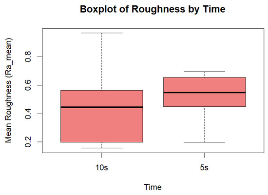 Figure 3 illustrates the comparison of mean roughness (Ra_mean) as a function of application times of 10 s and 5 s. The figure reveals that the mean roughness after 10 s of application is slightly higher and exhibits greater variability compared with after 5 s. This suggests that increasing the application time tends to generate rougher surfaces with a wider range of roughness variations. Additionally, the data spread is wider for 10 s, indicating that the impact of time on roughness might be more inconsistent if applied over longer periods. Conversely, 5 s of application results in lower and less variable roughness, indicating a more controlled and predictable effect on the surface.