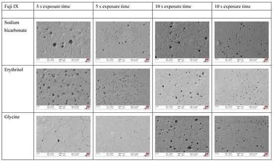 To identify which pairs of groups differ from each other, Tukey’s post hoc test is performed (Table 6). The results indicate that the mean roughness associated with the use of glycine is significantly lower than that associated with the use of sodium bicarbonate (difference = −0.4975, p = 0.00427). However, no significant difference is found between the other comparison pairs (erythritol/bicarbonate and glycine-erythritol), with p-values of 0.12898 and 0.11663, respectively. SEM analysis of the materials’ surface is represented in Figure 8 and Figure 9. At 500× magnification, the Fuji™ IX surfaces treated with different powders shows clear variations in surface roughness. Sodium bicarbonate consistently produces the highest roughness, especially after 10 s of application, characterized by pronounced abrasions and grooves. In contrast, glycine-treated surfaces exhibit the least amount of roughening, with smoother textures even after 10 s. Erythritol-treated surfaces are intermediate in roughness, with moderate abrasions and uniformity.